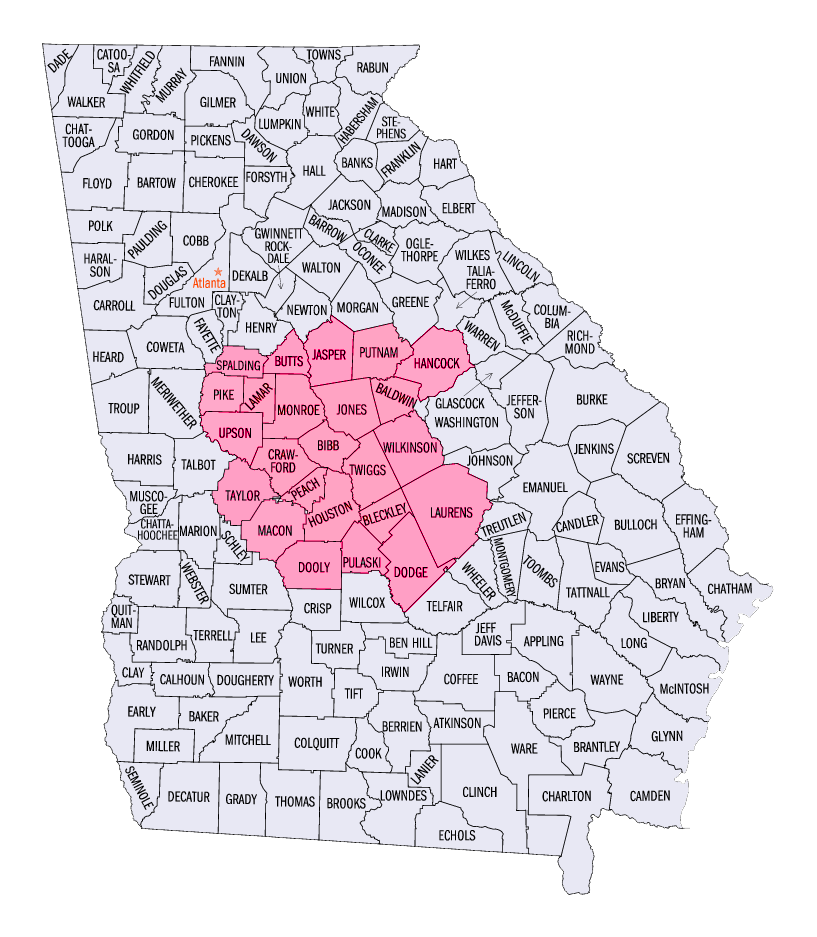 United in Pink serves the following counties: Baldwin, Bibb, Bleckley, Butts, Coffee, Crawford, Dodge, Dooly, Hancock, Houston, Jasper, Jones, Lamar, Laurens, Monroe, Peach, Pulaski, Putnam, Spalding, Taylor, Twiggs, Upson, Wilkinson
